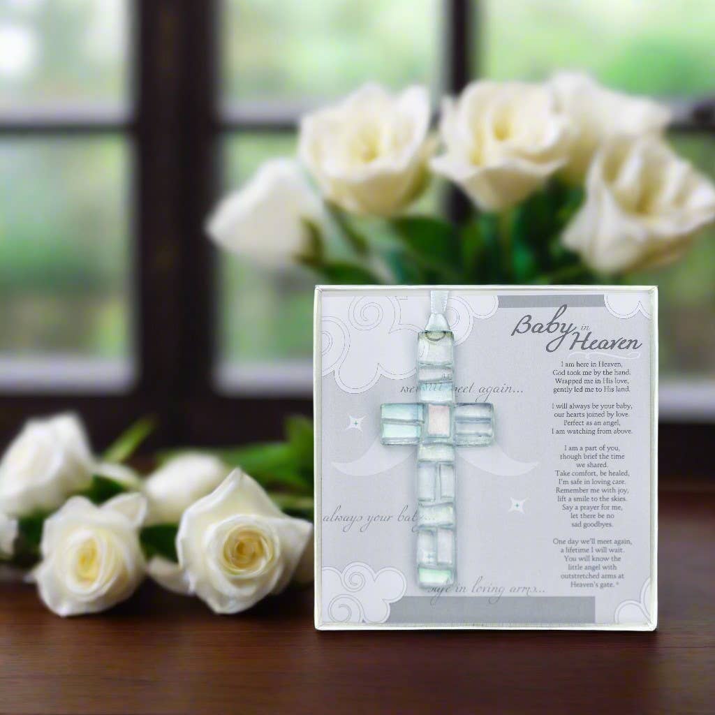 A truly special memorial gift for miscarriage or loss of a baby/infant. It is a remembrance gift of comfort for grieving families. Our 4" mosaic glass cross is handmade in the USA and comes gift-boxed with the beautifully written Baby Heaven poem by Teri Harrison.