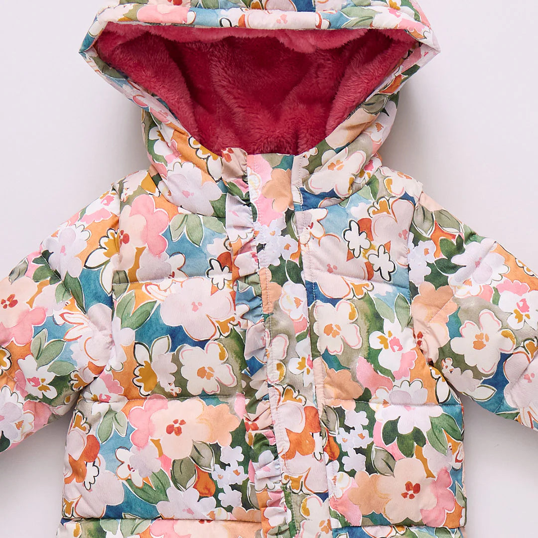 Fresh and Flowery! Keep your tiny bundle of joy warm and cozy in our super snuggly Baby Girls Snowsuit in Watercolor Floral. We've added a fun, flirty and feminine front ruffle to our water resistant Snowsuit. Smart details include a partial pink sherpa lining to protect baby from the chill, as well as fold-over hand and feet cuffs, a sturdy front zipper closure and a locker loop for easy hanging once inside and warmed up. Filled with premium duck down for warmth without weight.