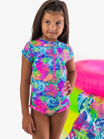Neon Ocean Coral Short Sleeve Rash Guard One Piece Swimsuit is a vibrant, Multi-Color choice for girls who love to stand out while staying protected. This neon ocean coral swimsuit features a playful ruffle detail and a convenient half-zipper, combining style and functionality. Designed for active girls, it boasts UPF 50+ sun protection, ensuring long hours of safe play under the sun. The 4-way stretch material allows for full freedom of movement, making it perfect for swimming and beach games. Additionally, the fabric resists pilling and snagging, maintaining its bright, eye-catching look over time. Whether it?s a pool party or a day at the beach, this girls' one-piece swimsuit, complete with full seat coverage, is an excellent choice for stylish and sun-safe water adventures.